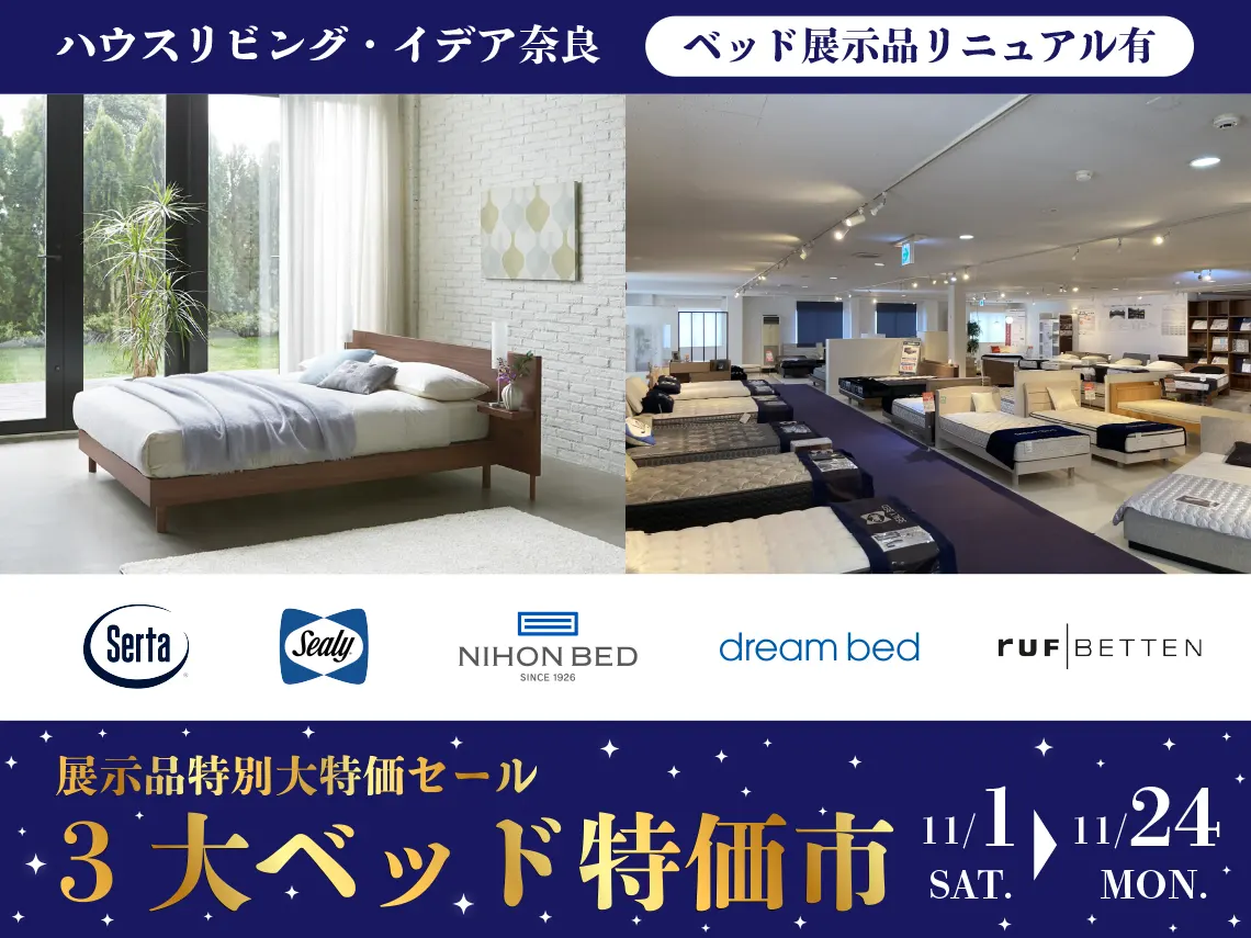 \贅沢な眠りを、あなたの毎日に。/ 11月1日(土)~11月24日(月・祝)の期間中、ハウスリビング・イデア奈良では「3大ベッド特価市」を開催いたします。日本を代表するベッドブランド〈日本ベッド〉〈サータ〉〈シーリー〉の厳選モデルを一堂に展示。熟練の技術と最新の睡眠科学から生まれたマットレスが、理想 […]