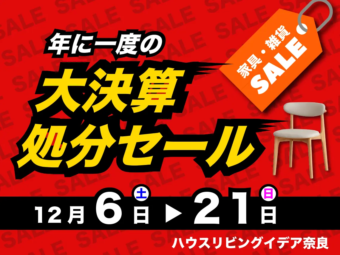 いつもハウスリビング・イデア奈良をご利用いただき、誠にありがとうございます。 日頃のご愛顧に感謝の気持ちを込めて、12月6日(土)~12月21日(日)の期間、今年最後の大イベントとなる「年に一度の大決算処分セール」を開催いたします。 1年間の感謝を形にした特別なセールで、店内にはダイニングセット、ソ […]
