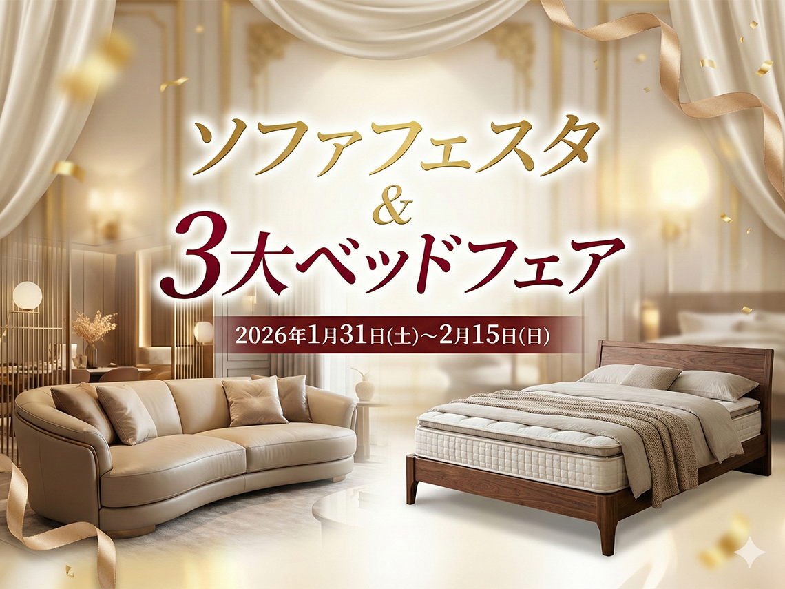 期間中 70周年記念特別価格にてご奉仕 \ソファフェスタ&3大ベッドフェア開催!理想のくつろぎを体感できる特別な2週間/ 1月31日(土)~2月15日(日)の期間、ハウスリビング・イデア奈良にて「ソファフェスタ&3大ベッドフェア」を開催いたします。 ソファフェスタでは、デザイン性と座り心地を兼ね備 […]
