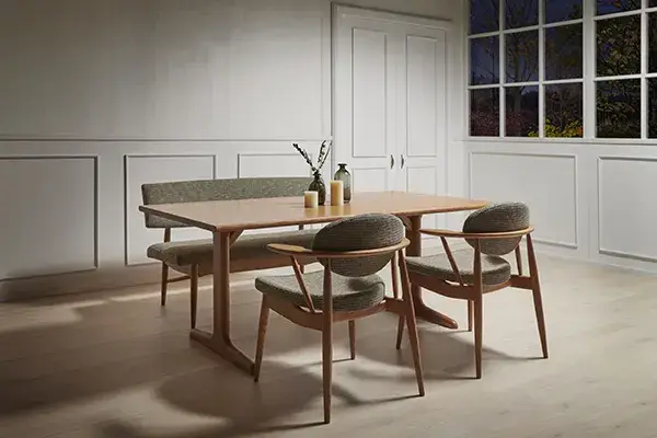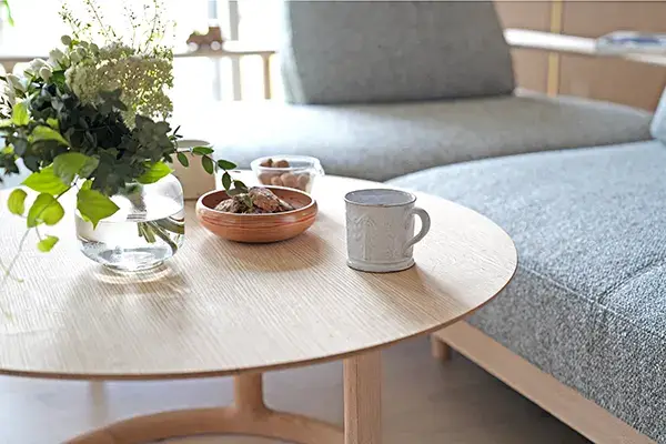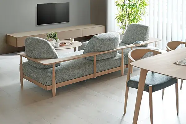 天然木の風合いを活かしたダイニングテーブル、美しい曲線が特徴のチェア、張地を選べる上質なソファなど、暮らしに寄り添う一品をオーダー可能。